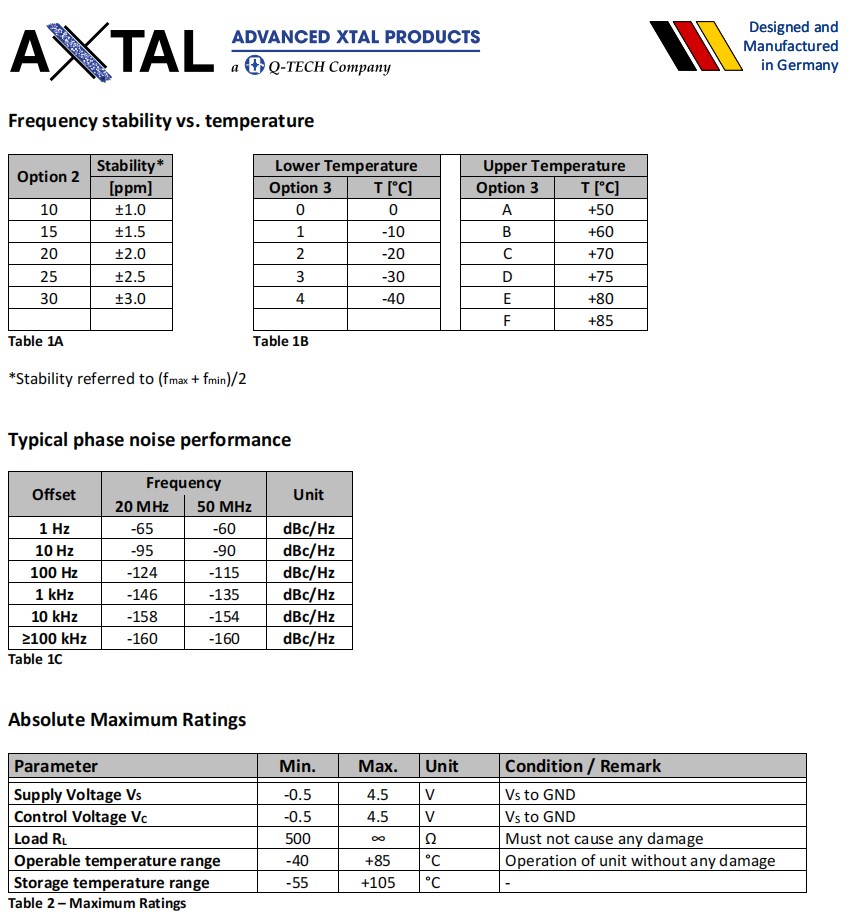 TCXO,AXLE5032S-FM-10-2C-20.000MHz,5032mm,AXTAL低相位噪声晶振,参数表