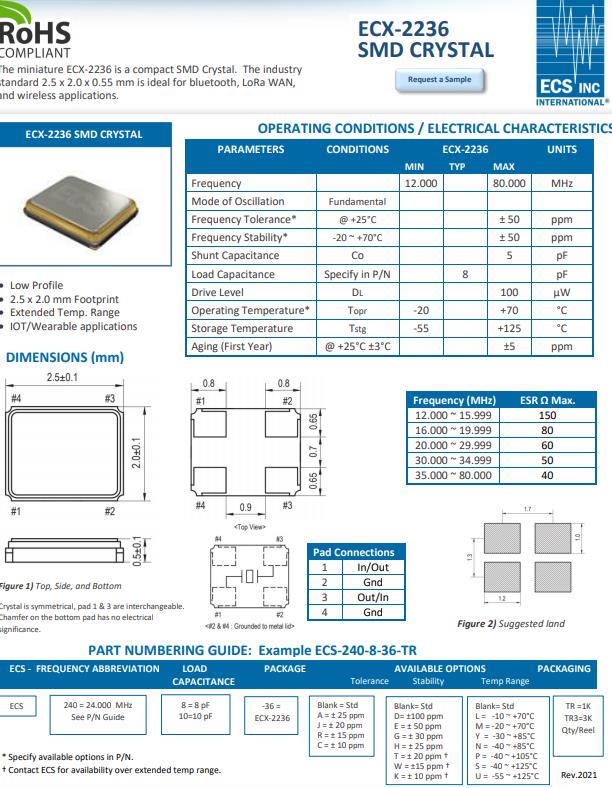 微型ECX-2236是一个紧凑的SMD晶振。编码ECS-160-8-36CKM-TR,这个行业标准2.5 x 2.0 x 0.55 mm,适用于蓝牙、LoRa WAN、和无线应用程序。