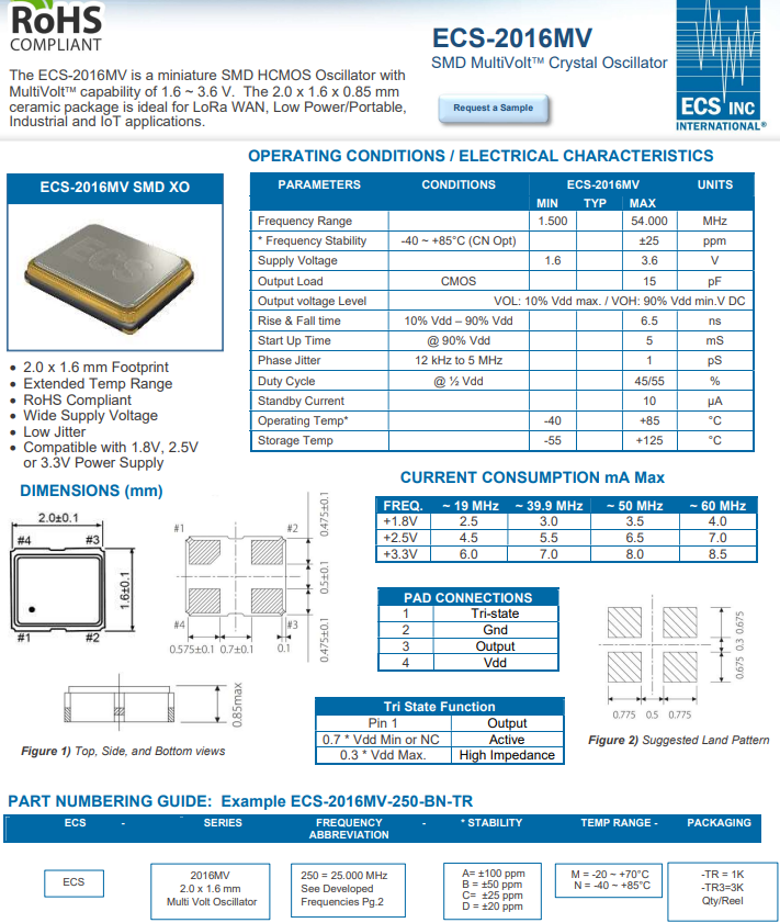| ECS-2016MV-250-CN-TR | 25 MHz | ±50ppm | -40°C ~ +85°C |