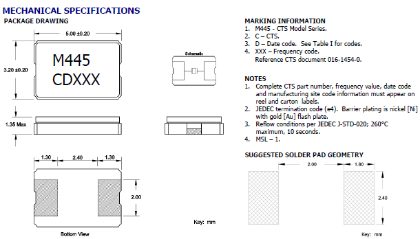 CTS晶振445,445C25D27M00000陶瓷晶振,美国CTS晶振公司,特点是:标准5.0mmx3.2mm玻璃密封包,基本晶体设计,频率范围8-50MHz,频率公差,±20ppm标准[其他公差可用],频率稳定性,±30ppm标准[其他稳定性可用],工作温度-40°C至+85°C,磁带和卷轴包装标准,EIA-481,RoHS符合欧盟指令2011/65/欧盟-无铅终端完成-豁免7(c)-I,含铅的电子元件445型是一种低成本设备,用于广泛的商业应用,包括笔记本电脑、计算机外设、视听、蓝牙和USB接口,pda,和汽车电子产品。