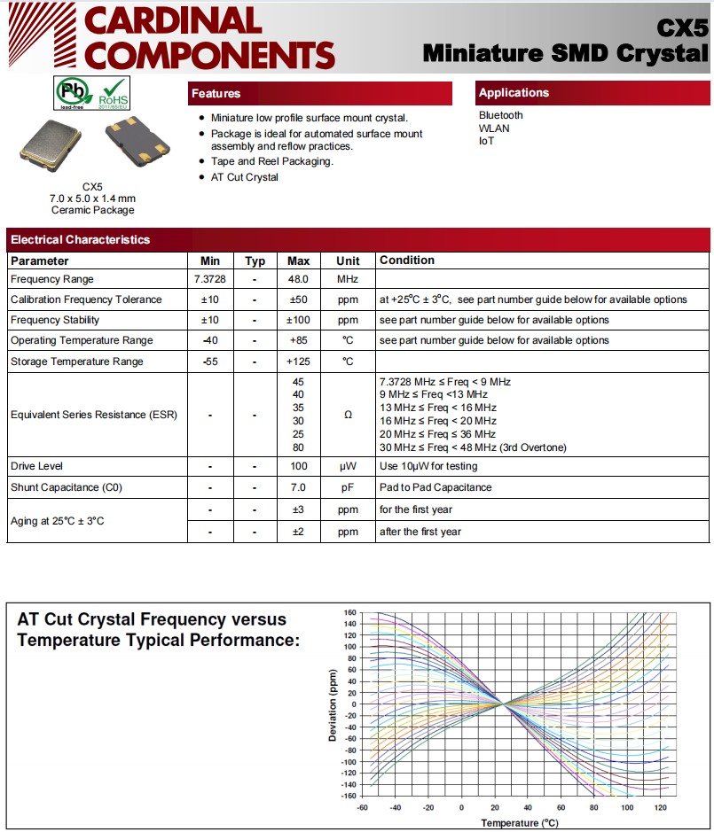 7050mm,CX5Z-A2B3C2-25-45.0D18,CX5,Cardinal蓝牙应用晶振,参数表