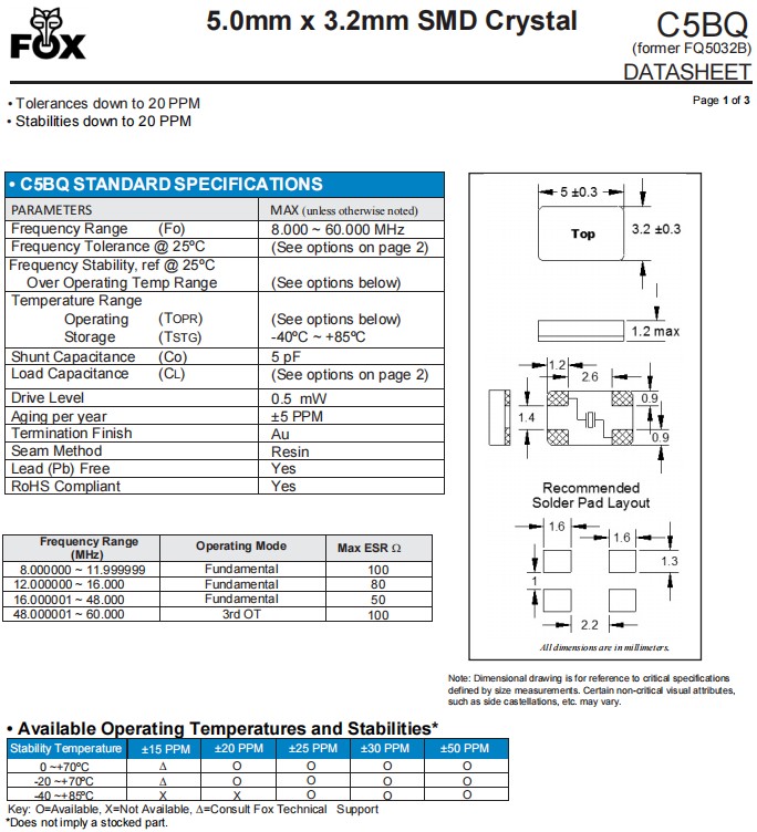 FOX福克斯C5BQ贴片晶振,FQ5032B-19.6608车载导航晶振,美国福克斯晶振,进口晶振,C5BQ是一款小体积晶振尺寸5.0x3.2mm晶振,四脚贴片晶振,FQ5032B-20.000无源晶振,FQ5032B-24.576石英晶振,石英晶体谐振器,FQ5032B-16.000石英水晶振动子,FQ5032BR-24.000无铅环保晶振,SMD晶振,具有超小型,轻薄型,耐热及耐环境特点,被广泛用于通讯设备晶振,电脑用晶振,无线网络晶振,蓝牙模块晶振,汽车电子晶振,车载导航晶振,GPS定位系统晶振,物联网晶振,数码电子等应用。