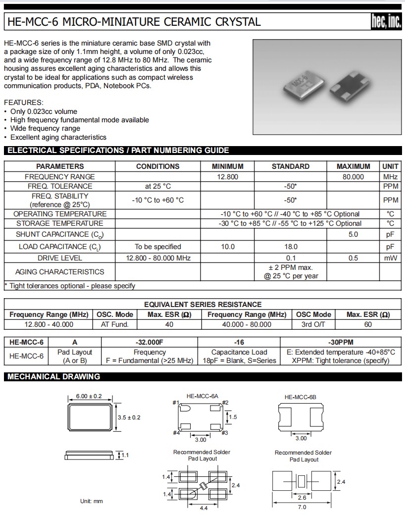 HE-MCC-6A-32.000F-16-30PPM,6035mm,32MHz,HEC品牌,美国进口晶振,HEC晶振,型号:HE-MCC-6系列,编码为:HE-MCC-6A-32.000F-16-30PPM,四脚贴片晶振,频率:32.000MHz,负载电容:16pF,紧密公差:±30ppm,小体积晶振尺寸:6.0x3.5x1.1mm,微型陶瓷晶体,石英晶体谐振器,贴片石英晶振,无源晶振,SMD晶振,6035晶振。HE-MCC-6系列是微型陶瓷基SMD晶体,封装尺寸仅为1.1mm高,体积仅为0.023cc,陶瓷外壳确保了优良的老化特性,并允许这种晶体是理想的应用程序:如紧凑的无线通信产品应用,PDA应用晶振,笔记本电脑应用。