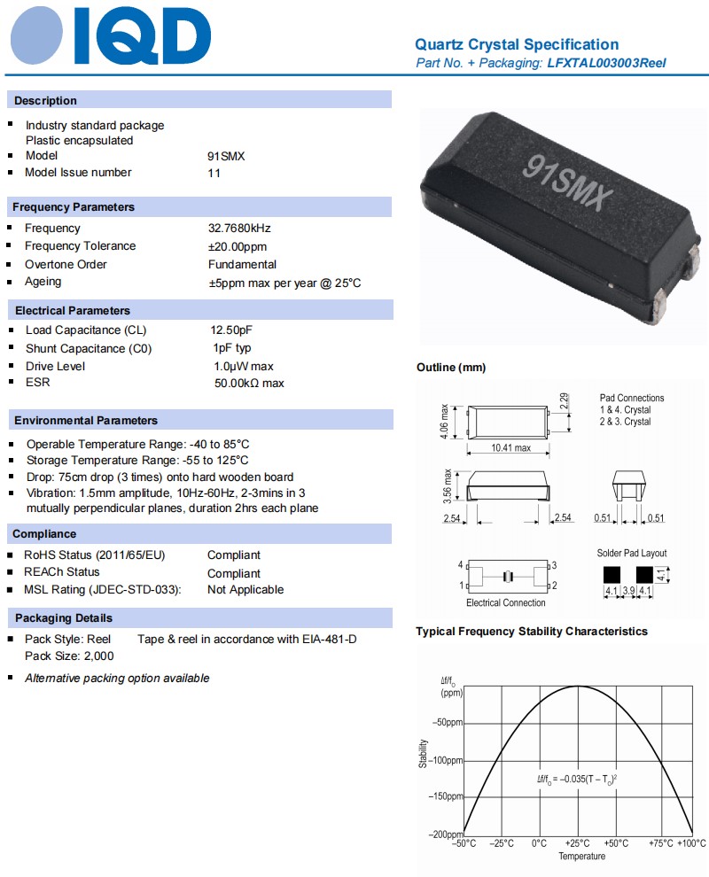 91SMX,LFXTAL003003REEL,32.768KHz,IQD品牌,陶瓷晶振,参数表
