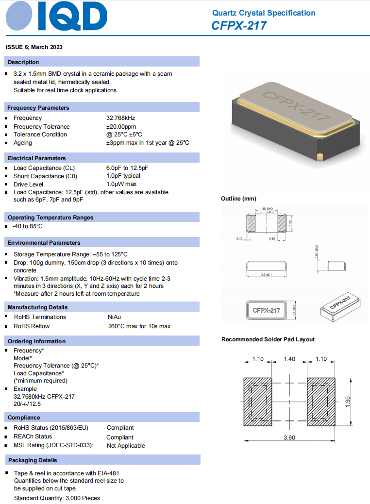 | LFXTAL054236REEL | IQD晶振 | CFPX-217 | CRYSTAL 32.7680KHZ 6PF SMD | 32.768 kHz |