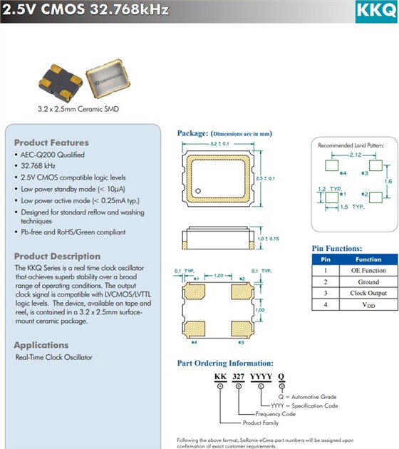 亚陶晶振KKQ系列2.5V汽车级CMOS晶体振荡器,KK3270049,32.768KHz晶振,ECERA低功耗晶振
