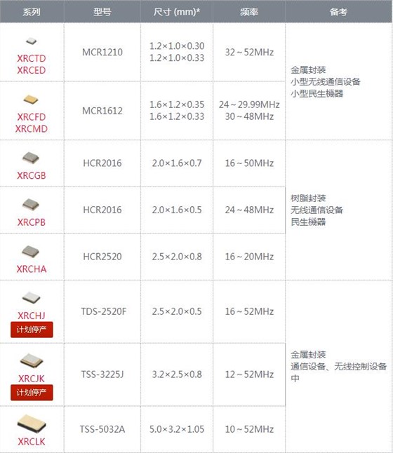 | 品名 | 型号 | 频率 | 频率公差 | 其他用途 |