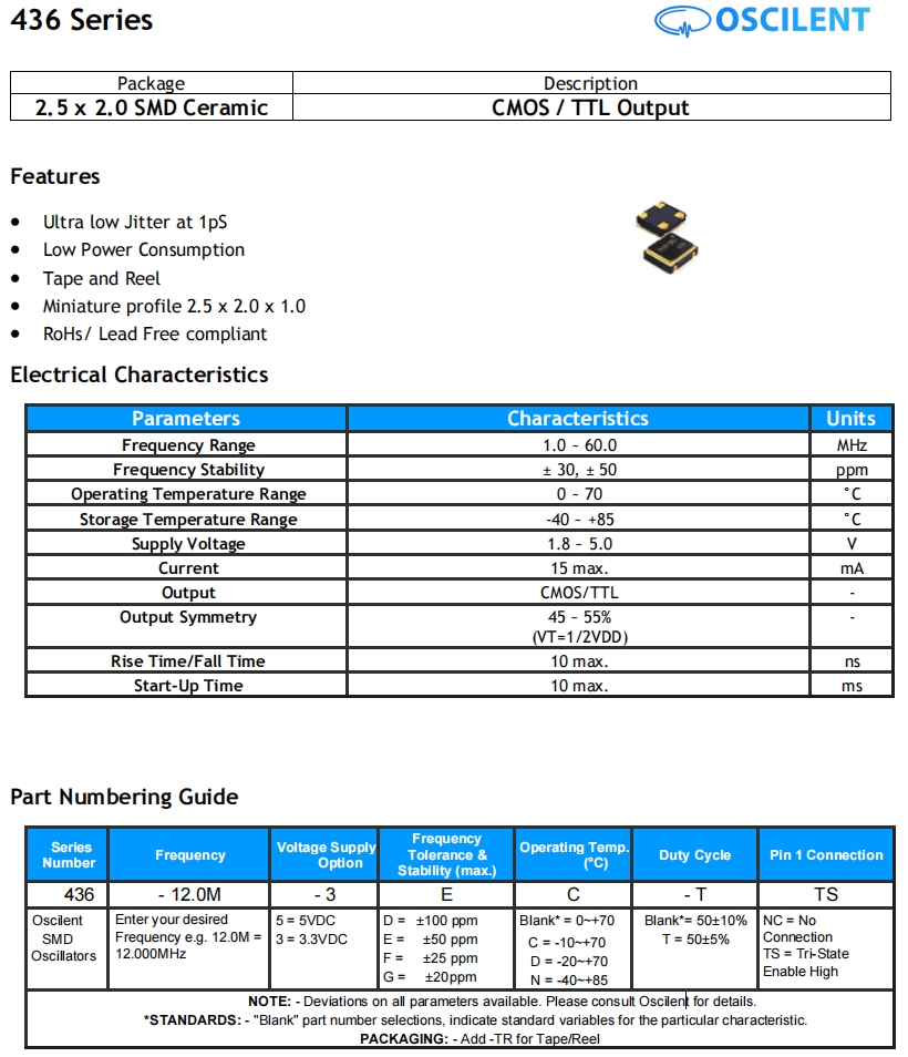 奥斯康利CMOS振荡器/436-33.0M-3FC-TTS/6G交换机晶振 参数表