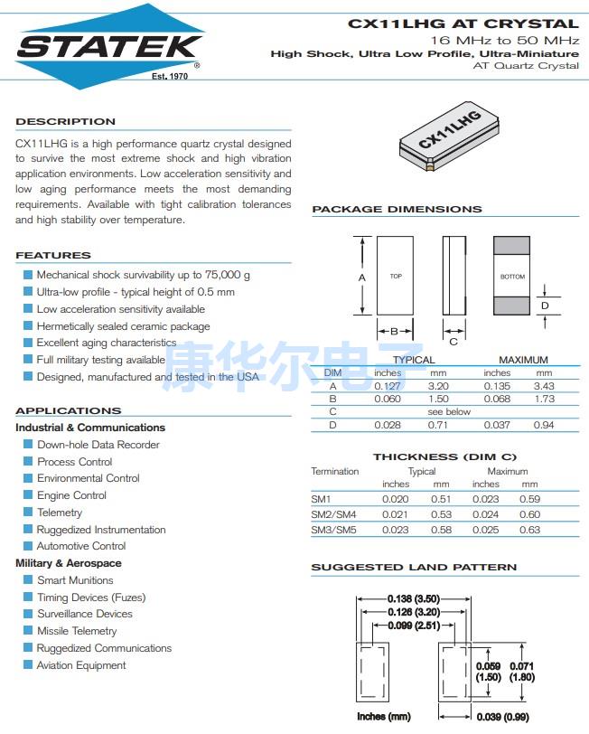 美国Statek晶振,CX11LHG汽车控制设备,CX11LSHG3CSM1-24.0M,100/100/I通信晶振,3215mm超小型,薄型,质地轻的表面贴片音叉型石英晶体谐振器,手机晶振,蓝牙晶振,产品体积小,特别适用于各种小巧的便携式消费电子数码产品,在移动通信领域得到了广泛的应用,晶振产品本身可发挥优良的电气特性,满足无铅焊接的高温回流温度曲线要求.