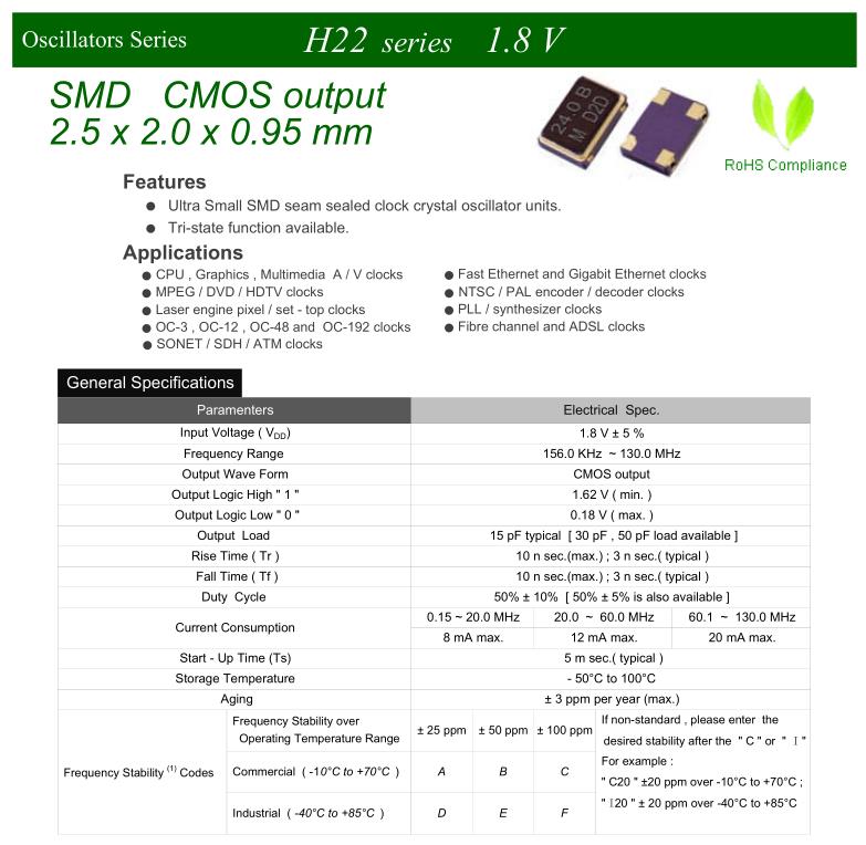 玛居礼晶振,2520贴片晶振,H22有源晶体.小型表面贴片型SMD晶振,最适合使用在汽车电子领域中,也是特别要求高可靠性的引擎控制用CPU的时钟部分.低频晶振可从7.98MHz起对应,小型,超薄型具备强防焊裂性,石英晶体在极端严酷的环境条件下也能发挥稳定的起振特性,产品本身具有耐热,耐振,耐撞击等优良的耐环境特性,满足无铅焊接以及高温回流温度曲线要求,符合AEC-Q200标准.